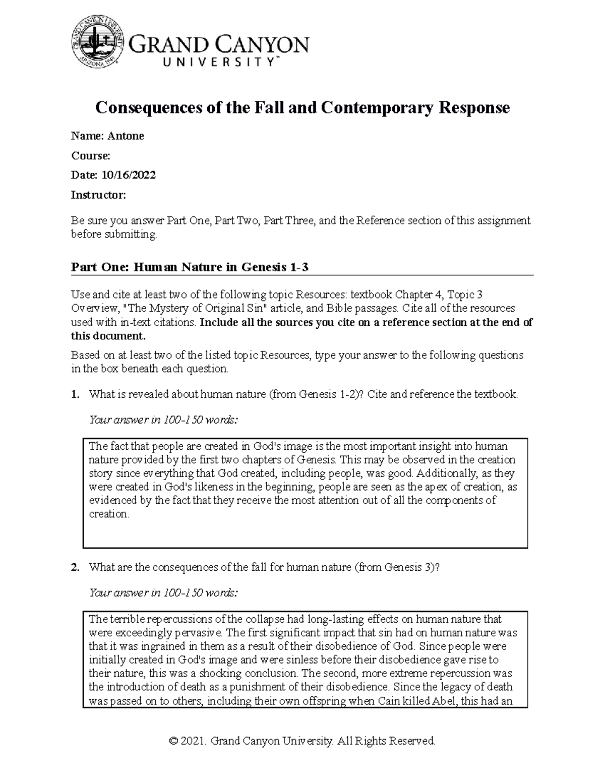 Consequences Of The Fall And Contemporary Response Ent Part One Human Nature In Genesis 1 Use Studocu